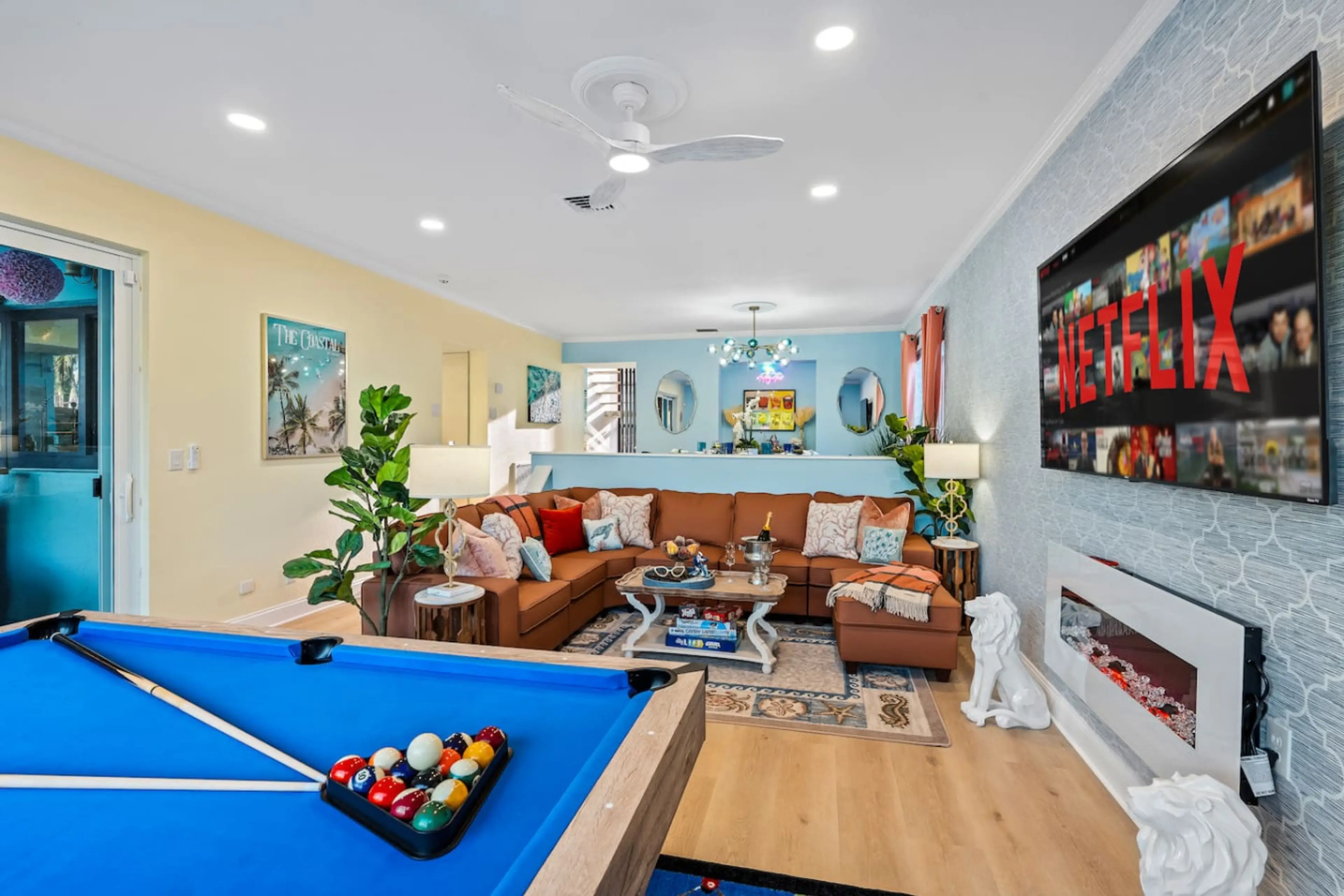Levitating stairs. A second-floor canal deck. A covered lanai with bar and Smart TV. Heated pool. Billiards and arcade inside. One guest said the photos should be in magazines. Another called it like living in a castle. Sleeps 12. Oakland Park. Minutes to Las Olas and Fort Lauderdale beaches. Pet-fr...