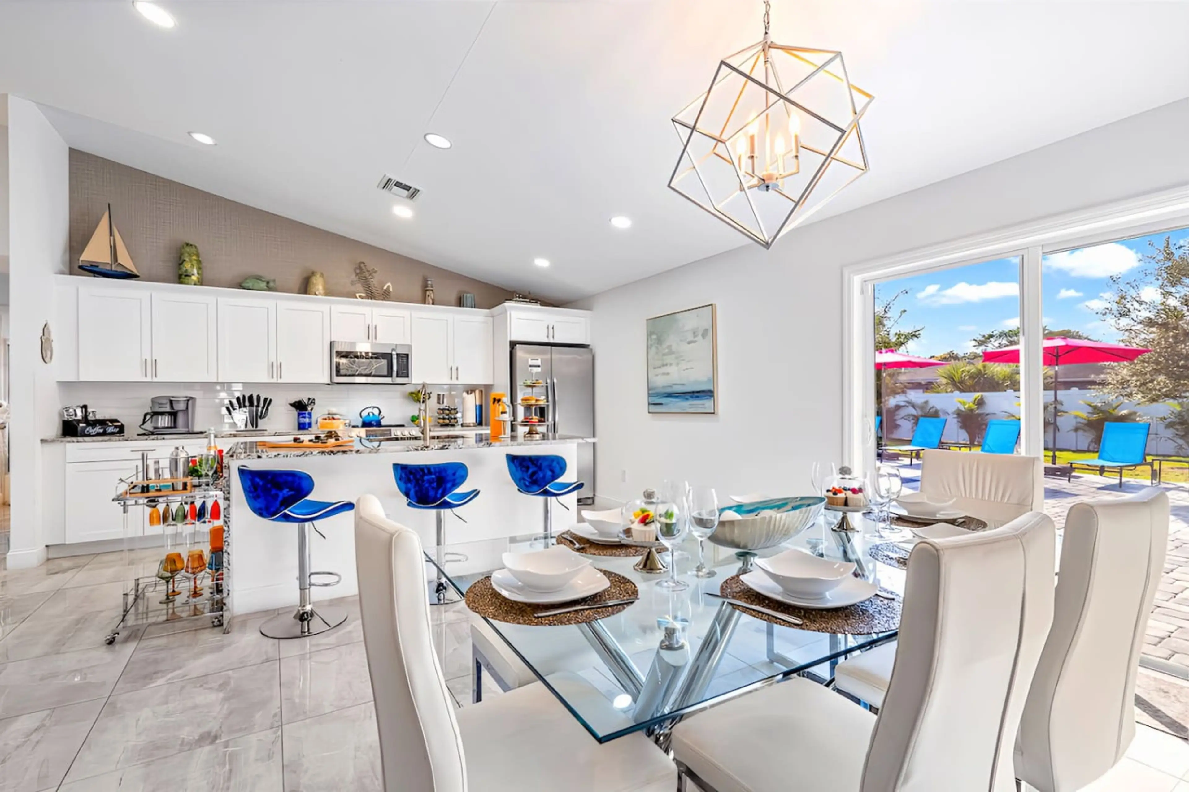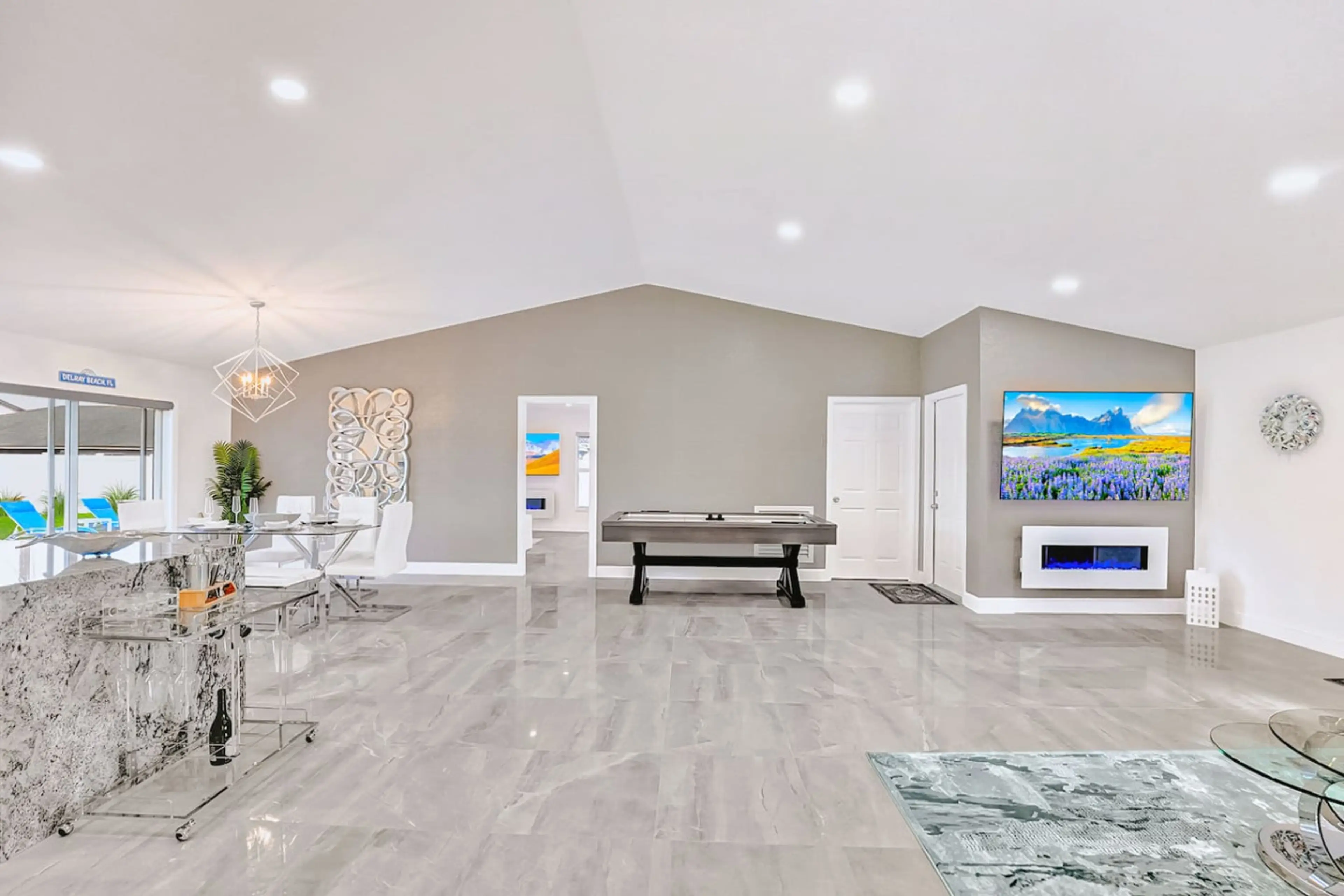 Vaulted ceilings, ensuite bathroom, 75" Smart TV, electric fireplace, and air hockey inside. Tiki hut with bar, seating, dining, and Smart TV, heated plunge pool, and fire pit outside. One guest said the first impression was "wow, followed by giggles." Sleeps 8. Pet-friendly. 8 minutes to Atlantic A...